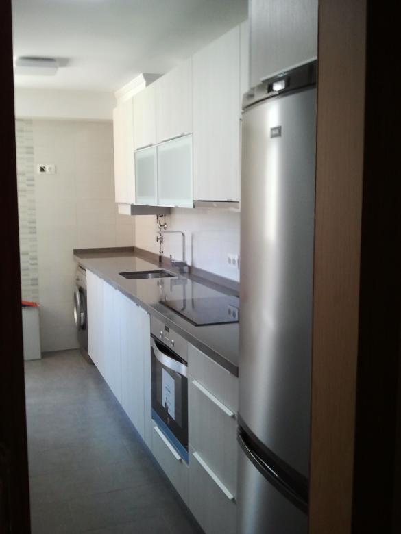Cocina dispuesta en un lineal de color Beig con tirador horizontal muy minimalista. Bajos con zocalo y altos con vitrinas de 45 cms.