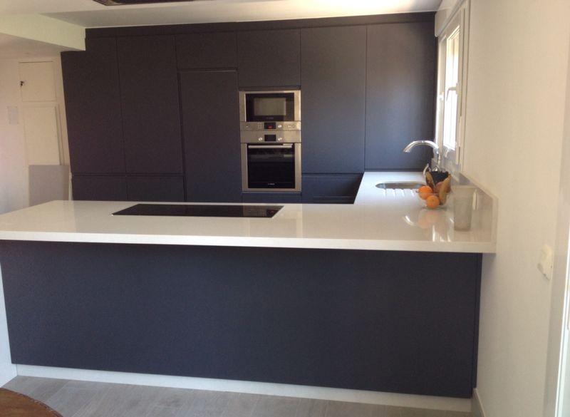Cocina en laca total mente integrada con encimera en silestone y campana a techo.